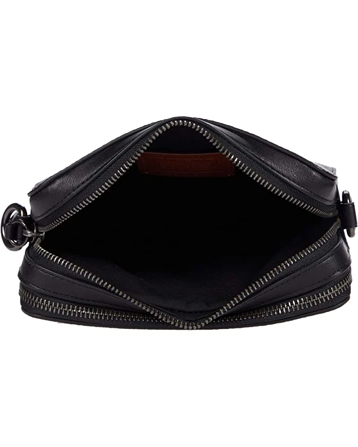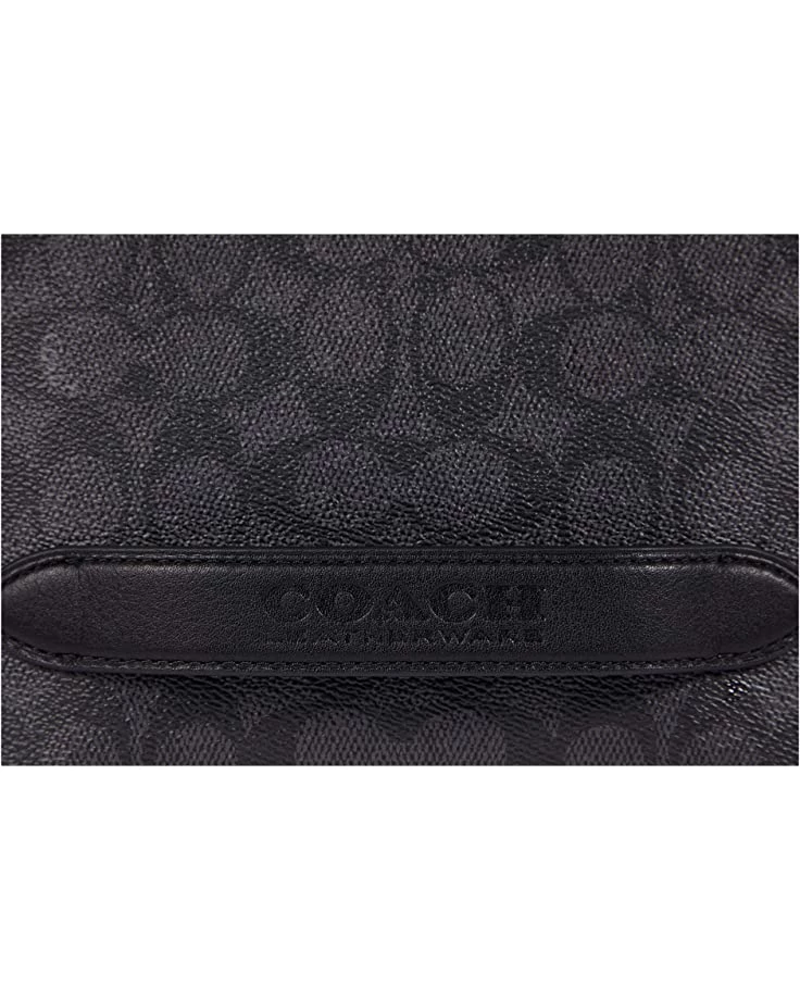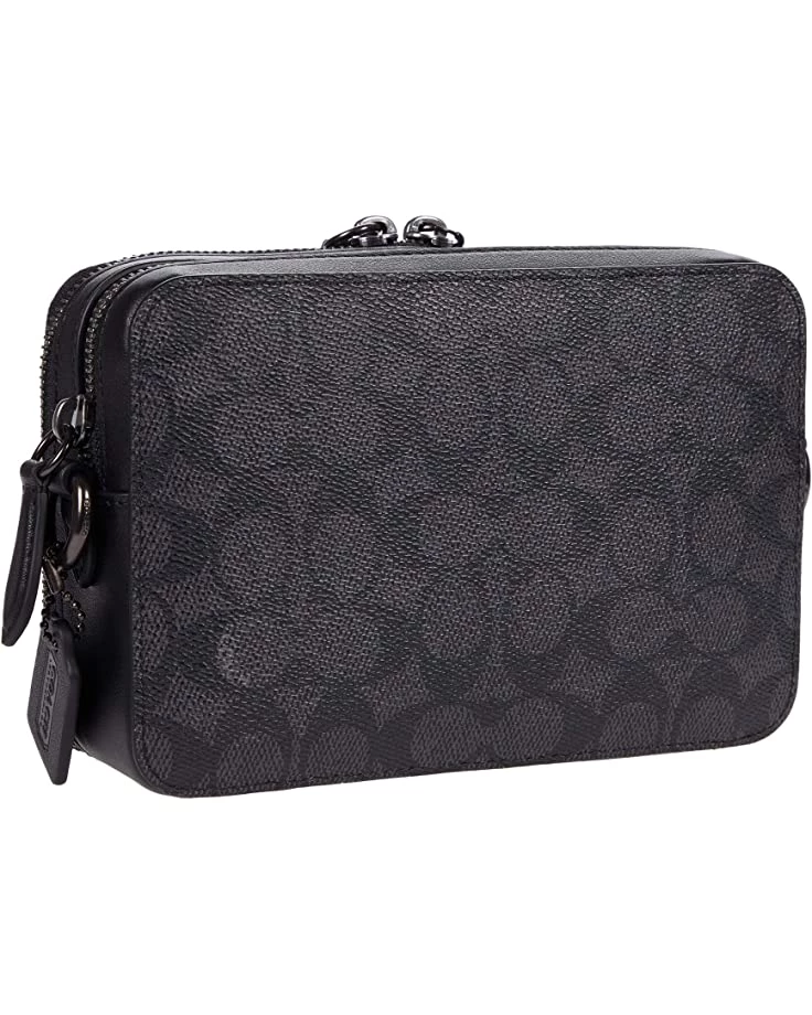 - Double zipper closure with a decorative COACH logo keycharm.